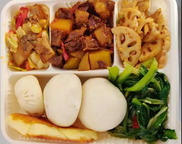 现场员工均佩带口罩 ;为阻止交织熏染,实验了饭盒分装机制 。